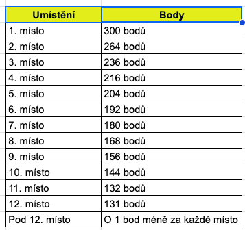 *Bez ohledu na celkový počet akcí se do vašich celkových bodů započítají pouze vaše 2 nebo 3 nejlepší výsledky. Pokud se zúčastníte více než 2 nebo 3 závodů, budou zohledněny pouze vaše 2 nebo 3 nejlepší výsledky a za další závody nebudou uděleny žádné dodatečné body.